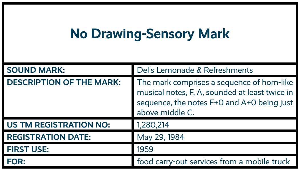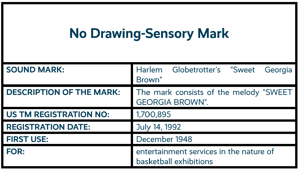 Other long-lasting sound mark registrations include the Del's Lemonade & Refreshments sound mark, first registered in May 1984 [3], the MGM Roaring Lion sound mark, first registered in June 1986 [4], and the Harlem Globetrotters "Sweet Georgia Brown" sound mark, first registered in July 1992 [5].